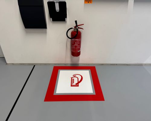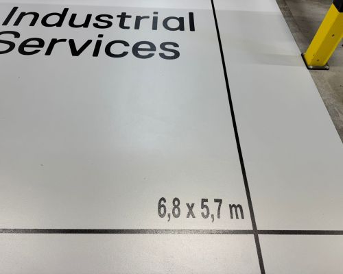 Markierung von Fußgänger-Korridoren in blauer Farbe, Kennzeichnung von Hydranten, Feuerlöschern, Texten und Kundenlogo