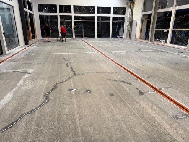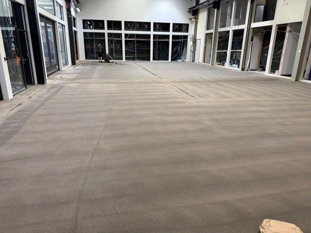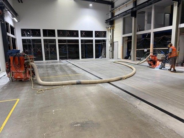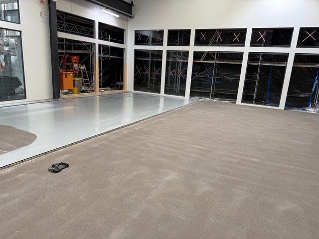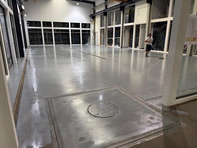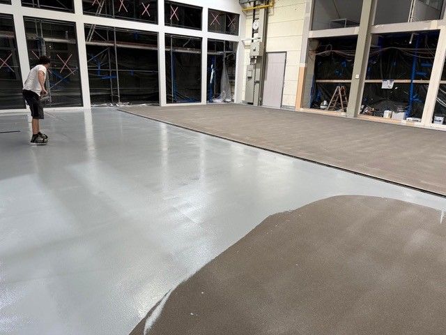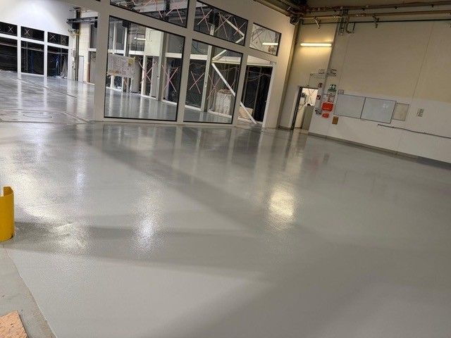 Kundeneingabe:Um aus einem alten Betonboden eine komplett neue Oberfläche zu schaffen, wurde ein rutschfester Epoxidharzestrich in Grau (RAL 7001) verwendet.