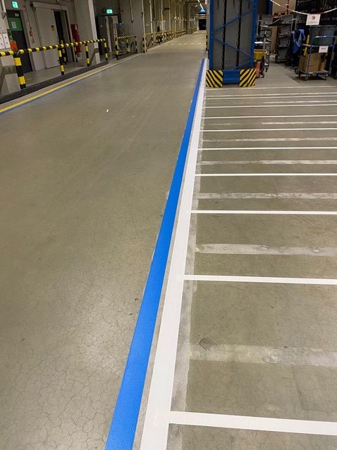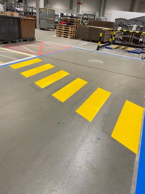 Kundeneingabe:Komplettterneuerung der Bodenmarkierung in Produktions- und Logistikbereichen, einschließlich der Entfernung vorhandener Markierungen mittels Präzisionsschleifen