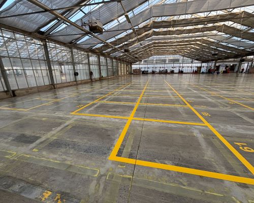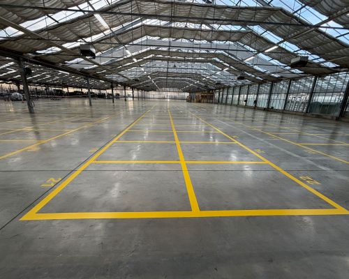 Durchführung der Bodenkennzeichnung für die Ablage von Blumenpaletten. Die Kennzeichnung beinhaltete auch Textcodes und Zahlen.