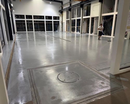 Aus dem alten Betonboden sollte eine völlig neue Oberfläche entstehen. Die Lösung war eine Epoxidharzbeschichtung in rutschfester Ausführung. Farbton: Grau RAL 7001.